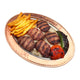 One skewer of beef shish one skewer of chicken shishwith bulgur, grilled tomato, grilled pepper and pieces ofpide bread. Two skewers individual plate. It is marinatedwith dairy products.